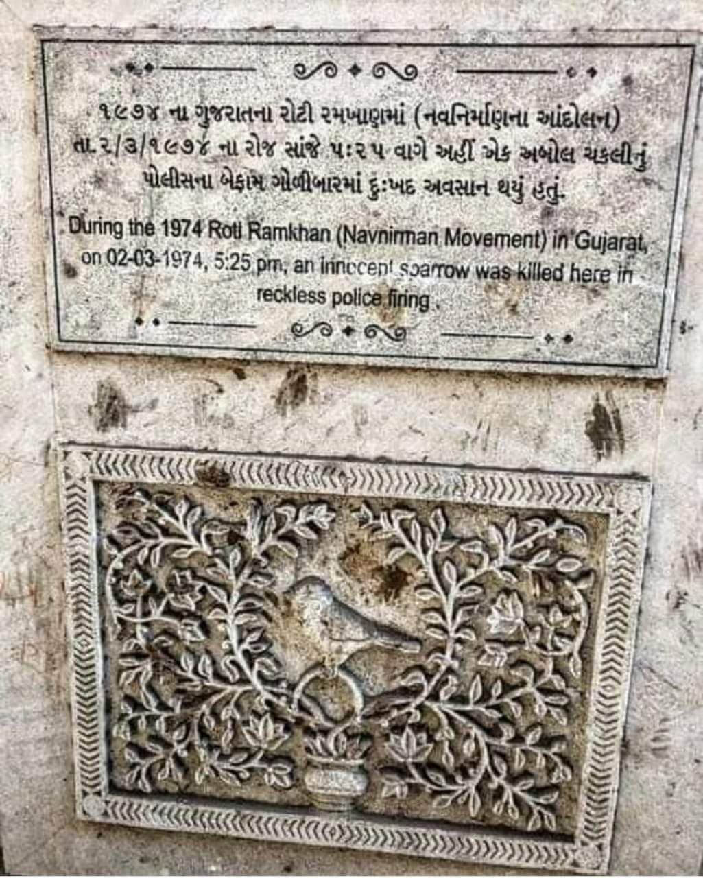 कुछ भलेमानुष बाद में वहाँ से गुज़रे तो उन्होंने चिड़िया के उस शव को पाया। उनके भीतर रौशनी की तरह, इलहाम की तरह यह गूँजा कि प्रकृति की यह सुन्दर सन्तान पूर्णतया निर्दोष थी, उसका कोई भी दोष नहीं था, तब भी उसे मनुष्यों के बीच चल रहे फ़साद का शिकार होना पड़ा। आत्मग्लानि ने उन्हें बेध दिया। उन्होंने उस मृत चिड़िया का एक स्मारक बनवाने का निर्णय लिया। वह स्मारक आज भी अहमदाबाद के अस्टोडिया में पक्षियों के दाना चुगने के लिए बनाए गए अढ़ाई सौ चबूतरों के साथ मौजूद है।
