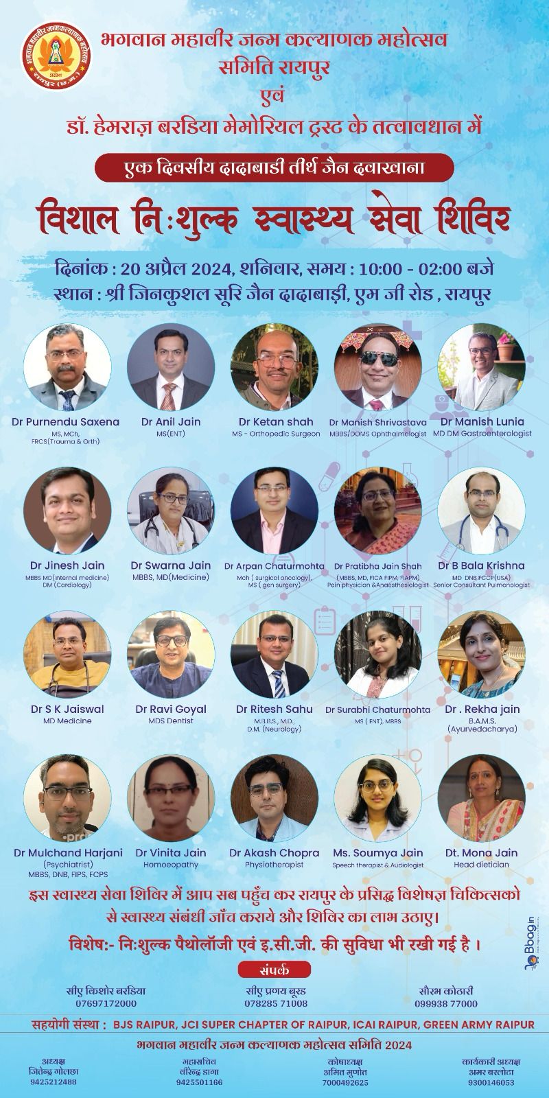 भगवान महावीर जन्म कल्याणक महोत्सव समिति एवं डॉ हेमराज बरडिया मेमोरियल ट्रस्ट के संयुक्त तत्वावधान में विशाल निशुल्क एक दिवसीय मेडिकल कैंप का आयोजन 20 अप्रैल को रायपुर के एमजी रोड, दादाबाड़ी में किया जाएगा