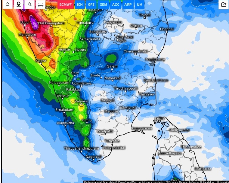 Heavy rainfall very likely at isolated places over Tamil Nadu, Puducherry & Karaikal on 29th; North Interior Karnataka on 29th & 30th; Kerala & Mahe, Coastal & South Interior Karnataka during 29th July – 01st August.